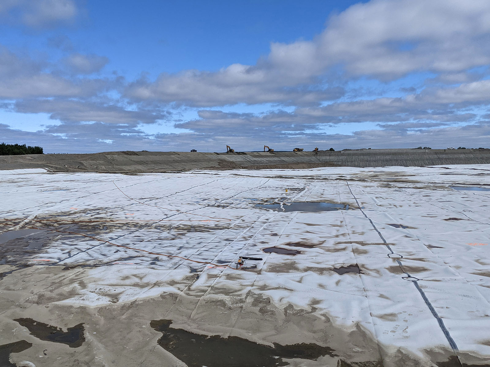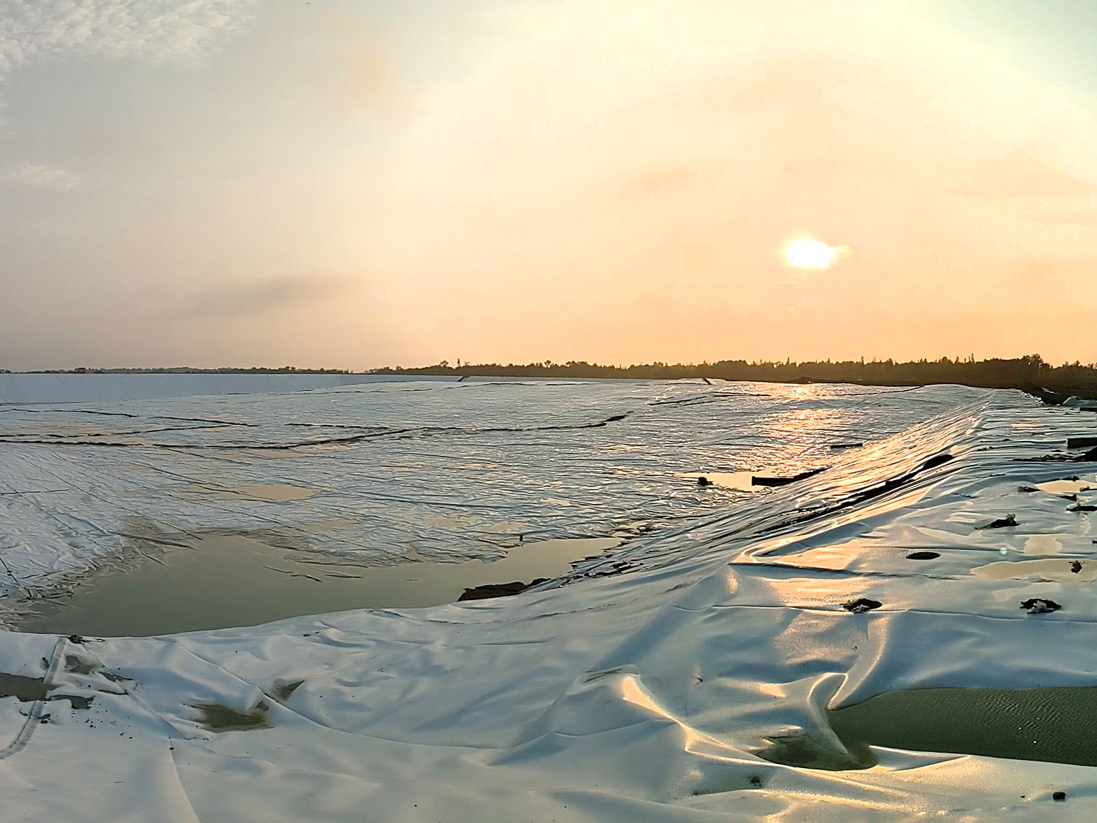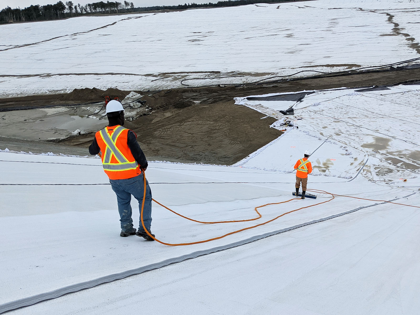 The construction of a new tailings pond at the LaRonde Mine began in the fall of 2020. The bottom and the dikes were covered with a 1.5 mm thick white low-density polyethylene geomembrane. The services of Groupe Alphard were retained for the quality assurance of the synthetic materials as well as the leak detection by water puddle on the exposed geomembrane. The total area of the portion tested in 2021 was 186,100 m2.