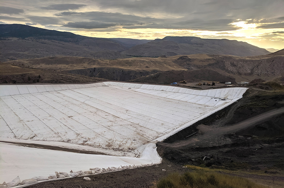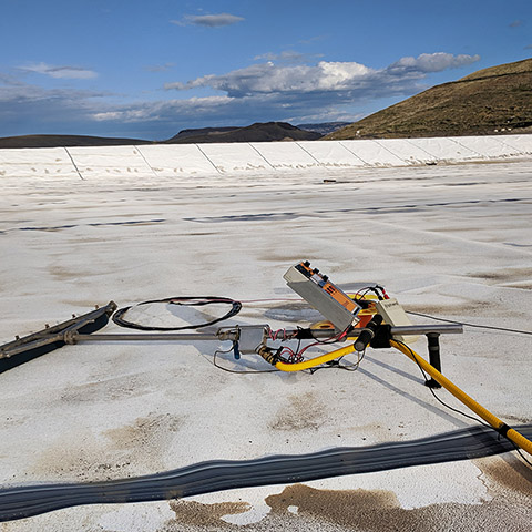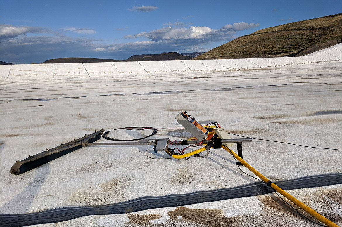 Electrical leak location survey using the water puddle and dipole methods over approximately 20,000 m 2 . The water puddle method was used to detect any small faults that may have occurred during the manufacturing, transportation or installation of the geomembrane. The dipole method was then used to survey both of the gravely covering layers, allowing for the detection of leaks produced during the installation of the covering layers.