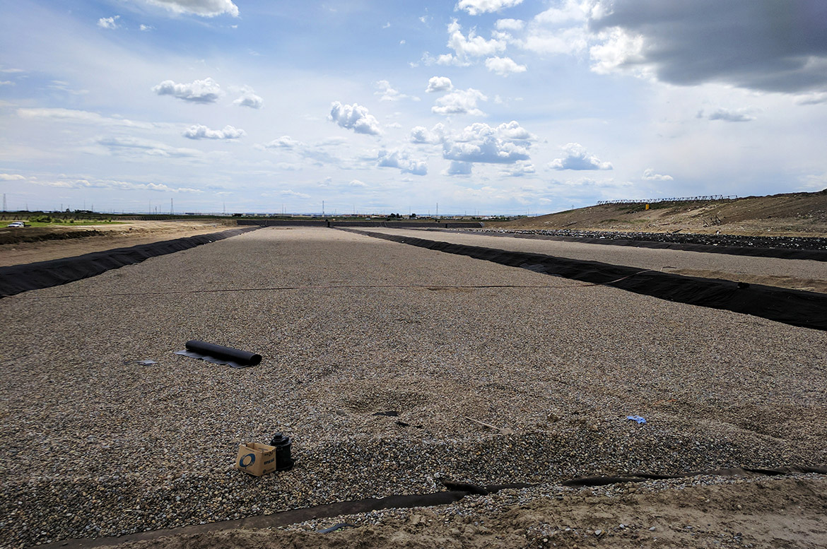 Dipole method electrical leak location survey over approximately 35,000 m 2 . The dipole method was used on the site’s covering gravel layer, in order to detect leaks produced during the installation of the covering material.