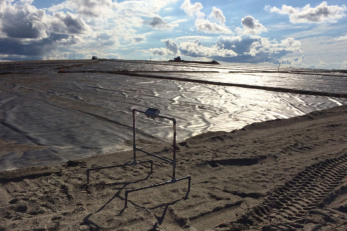 Barvue mining site is a disused gold and silver mine. The Quebec Ministry of Natural Resources has undertaken the restoration of the site’s tailing pond as well as other infrastructure projects in the mine’s vicinity, including the rerouting and regreening of the Marcotte steam. Following the completion of phase IV capping works, Groupe Alphard performed water puddle and dipole method electrical leak location surveys across the cap’s total area of 255,000 m 2 .