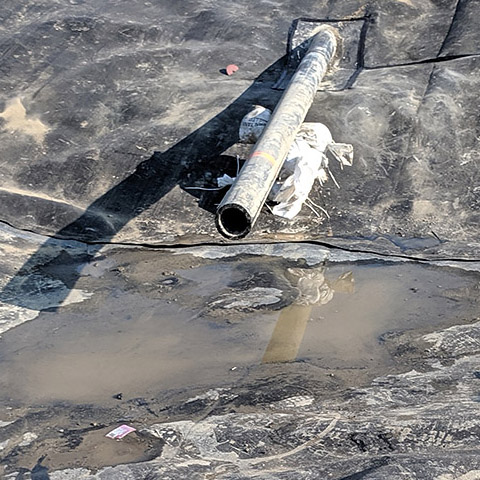 These stations are generally comprised of concrete and pipework and are therefore electrically conductive. In regard to the water lance method, the station represents a large fault in the geomembrane layer, creating false leak signals as the water used during the survey runs toward the basin’s low point and makes contact with the station’s conductive elements. It is sometimes necessary to install a physical barrier around the station with clay or bentonite to prevent water making contact with the station during the test.